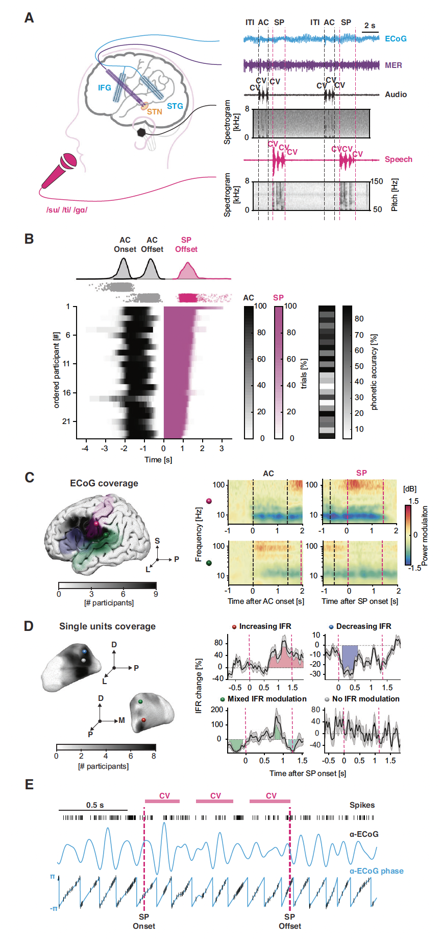 The Brain Modulation Lab has pioneered the study of basal ganglia and thalamic contributions to human speech production, an area that had been largely overlooked by prominent speech neuroscience models. This work was funded through two BRAIN Initiative U01 awards. By leveraging the rare opportunity to record simultaneously from the cortex and subcortical nuclei in awake humans undergoing deep brain stimulation surgery, our group was the first to establish that subthalamic nucleus (STN) neurons encode aspects of speech production, revealing temporally distinct populations that reflect both early planning and late motor execution phases of speaking (Lipski et al., Journal of Neuroscience, 2018). We subsequently demonstrated that STN single-neuron spike timing is phase-locked to theta-alpha oscillations in posterior perisylvian cortex, and that the timing of this coupling predicts speech sound accuracy (Vissani et al., Nature Communications, 2025). We also showed that STN neurons are dynamically phase-synchronized to cortical oscillations during movement, independent of firing rate changes (Lipski et al., Journal of Neurophysiology, 2017), and that the STN influences sensory and motor cortex during force production (Alhourani et al., Cerebral Cortex, 2020). Our work has further demonstrated that auditory cortex directly influences the STN during speech motor planning in a manner modulated by lexicality (Weiss et al., Neurobiology of Language, 2023), that articulatory gain is represented across the cortico-basal ganglia network (Dastolfo-Hromack et al., Cerebral Cortex, 2022), that the STN and cortex show distinct lexicality effects during reading aloud (Chrabaszcz et al., Journal of Neurolinguistics, 2021), that the thalamus actively participates in lexical processing during reading aloud in a lateralized and region-specific manner (Wang et al., Journal of Neuroscience, 2022), and that fundamental differences in aperiodic neural dynamics distinguish cortical from subcortical activity (Bush et al., Cerebral Cortex, 2024).